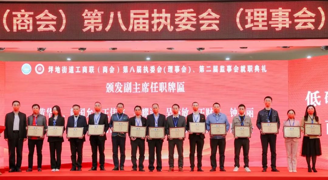 ? 2022年12月7日下午,我公司參加坪地街道工商聯(商會)第八次會員大會暨第八屆執委會(理事會)、第二屆監事會就職典禮,經大會選舉,公司副總經理柯漢周當選坪地商會副主席。